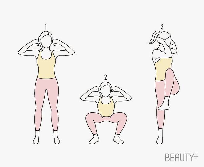 2 등과 허리를 곧게 세운 채 천천히 깊게 앉았다가 일어난다. 3 팔꿈치와 반대쪽 무릎이 배꼽을 향하도록 몸통을 트위스트하며 무릎을 올린다. 양쪽으로 몸을 트위스트한 뒤 다시 2번 스쿼트 자세로 돌아와 반복한다.