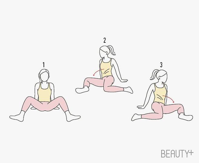 1 바닥에 앉아 무릎을 세운다. 두 발은 엉덩이 너비로 벌리고, 두 손은 뒤로 짚되 몸이 뒤로 넘어가지 않도록 주의한다.