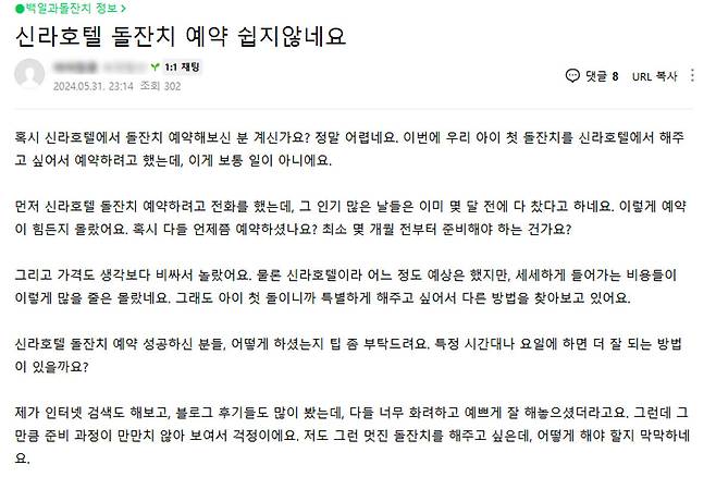 복수의 온라인 커뮤니티에 따르면 돌잔치를 위해 두 달 전부터 예약 전쟁이 벌어지는 것으로 확인됐다. 호텔 업계에 따르면 신라호텔 중식당 ‘팔선’에서 돌잔치를 하기 위해서는 매월 1일 오전 9시 신라호텔 홈페이지와 애플리케이션(앱)을 통해 이루어지는 예약 전쟁을 뚫어야 하는 것으로 확인됐다.