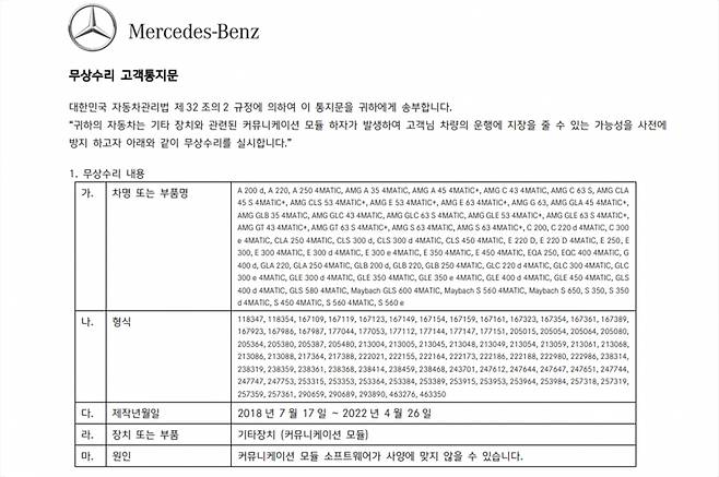 이들 모델은 커뮤니케이션 모듈 소프트웨어가 사양에 맞지 않을 수 있으며, 이런 경우 메르세데스 미 서비스 통신 모듈의 품질과 시스템 안정성이 개선되지 않을 수 있는 가능성이 확인됐다.
