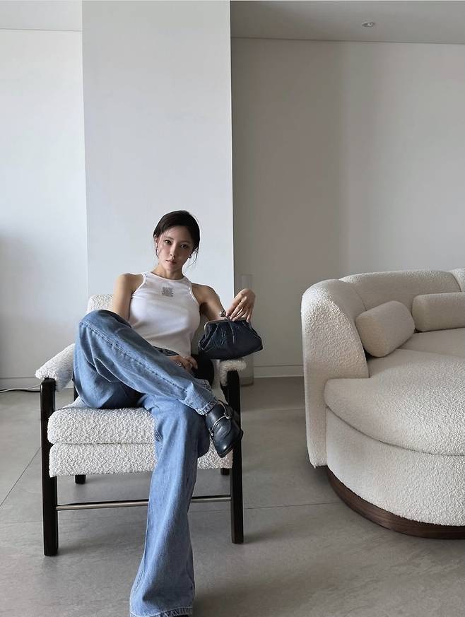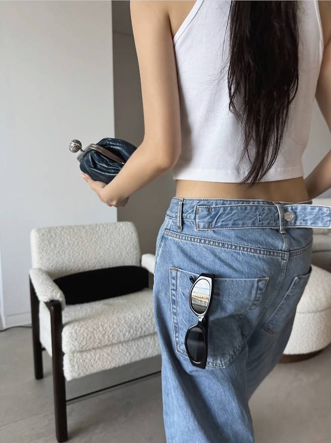 군살 하나 없이 매끈하게 드러난 탄탄한 팔과 잘록한 허리가 돋보였으며, 벨트를 탈착 한 청바지는 힙하면서도 내추럴한 무드를 자아냈습니다.