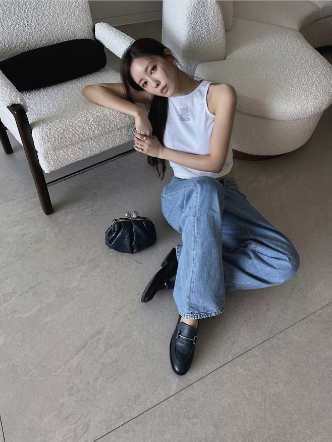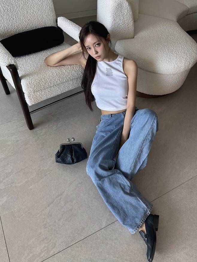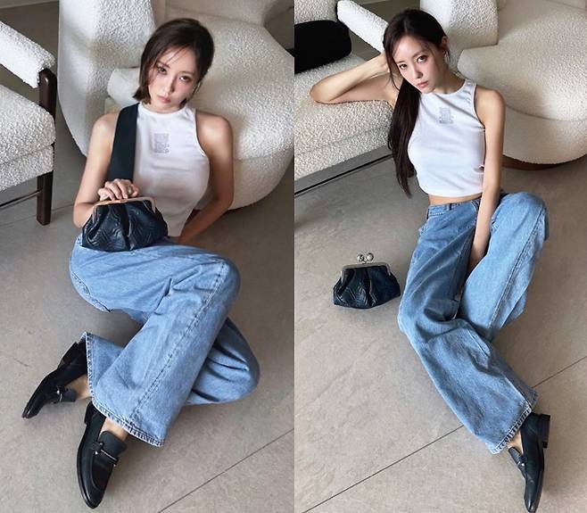 화이트 슬리브리스 크롭탑에 헐렁한 핏이 돋보이는 와이드 데님 팬츠를 매치해 심플하지만 강렬한 데일리룩을 완성했습니다.
