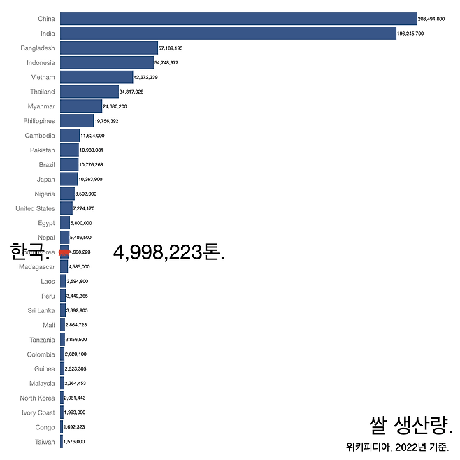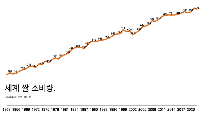 - 생산량은 2021년 388만 톤에서 지난해 370만 톤으로 줄었지만 소비가 훨씬 더 빠르게 줄었다. 게다가 해마다 41만 톤의 쌀이 5% 관세로 의무 수입되고 있다. 양곡 비축과 판매 과정에서 연간 5000억 원 이상 손실을 기록하고 있다.