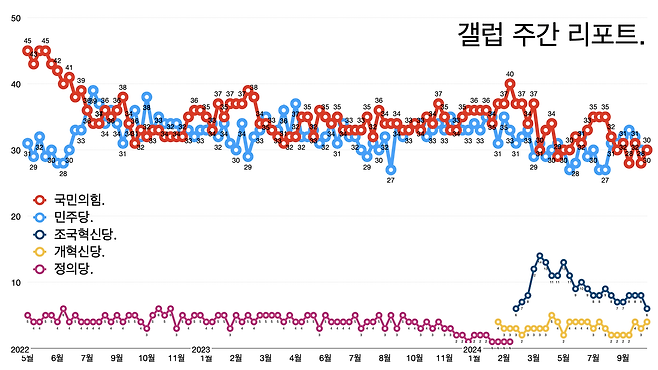 - 국민의힘과 민주당 지지도는 정확히 30%다.