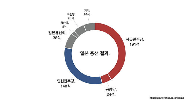 - 자민당과 공명당 의석수는 각각 191석과 24석으로 65석과 8석씩 줄었다.
