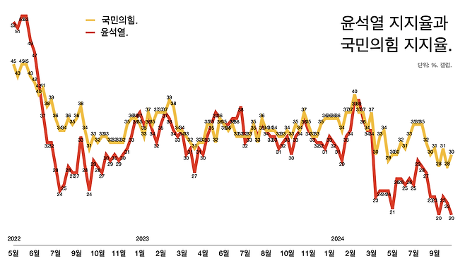- 대통령 지지율과 국민의힘 지지도의 격차는 국민의힘 지지자들 가운데 윤석열을 지지하지 않는 사람이 꽤 된다는 의미다. 윤석열을 반대하는 사람들이 민주당으로 옮겨가지 않았다는 의미도 된다.