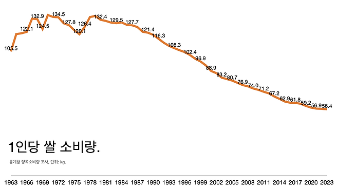 - 지난해 1인당 쌀 소비량은 56.4kg, 30년 전 110.2kg의 절반 수준으로 줄었다.