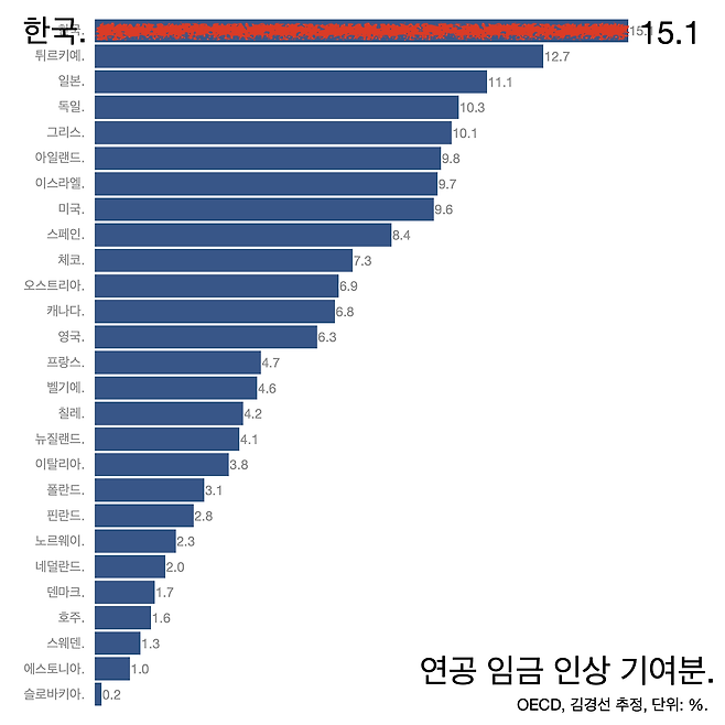 - 김경선(한국공학대 교수)은 연공급 임금 체계를 손봐야 한다고 주장했다. 근속 연수에 따라 임금이 늘어나는 구조에서는 정년 연장의 부담이 크다. 한국은 연공임금 인상분이 15.1%로 OECD 평균 5.9%보다 높다.