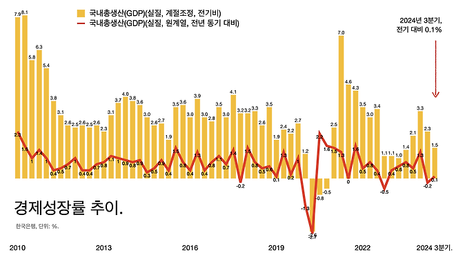 - 한국은행이 지난 4월 발표한 1분기 성장률은 전기 대비 1.3%, 전년 동기 대비 3.3%였다. 최상목(기획재정부 장관)이 “우리 경제에 선명한 청신호가 들어왔다”고 평가했다.
