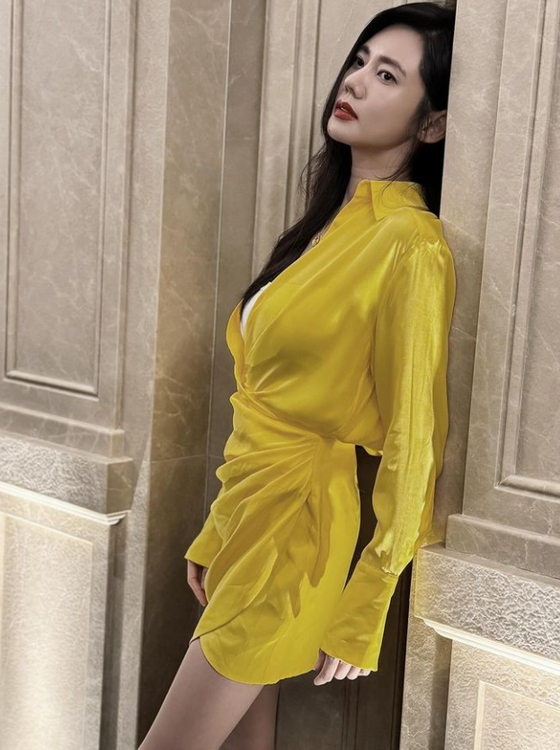 추자현은 옐로우 컬러 미니 드레스에 골드 목걸이를 매치해 세련된 스타일링을 선보였다.