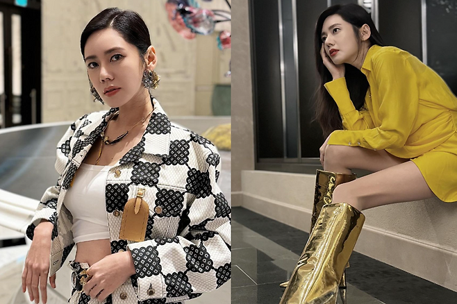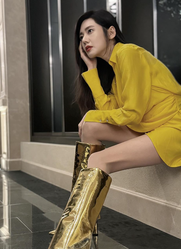 추자현은 옐로우 컬러 셔츠형 미니 드레스에 골드 컬러 부츠를 신고 아름다운 자태를 뽐냈다.