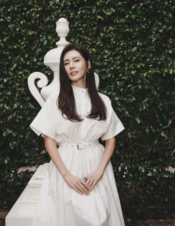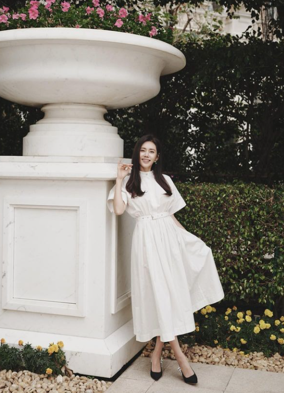 추자현은 하이넥으로 된 반팔 원피스에 진주 귀걸이와 반지로 고급스러운 느낌을 살렸다.