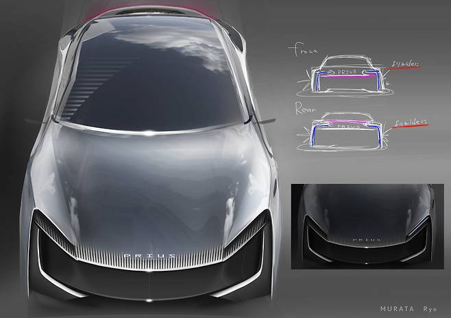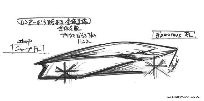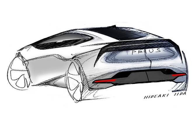 5세대 프리우스 디자인이 추구하는 방향성은 초기 스케치에 고스란히 드러난다. 훨씬 더 극단적인 쐐기 형태였다. 따라서 거주성과 충돌 안전성 등 현실적 문제를 놓고, 엔지니어와 치열한 조율이 있었다는 사실을 짐작할 수 있다. 차체 너비를 줄이고 실루엣을 좀 더 현실적으로 다듬었지만, 디자이너의 의도를 대부분 양산 모델로 반영한 점 또한 인상적이다.