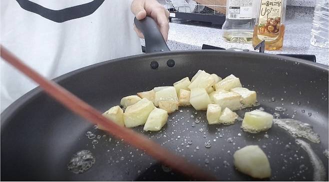 감자를 넣고 올리고당이 골고루 입혀질 수 있게 잘 저어주세요