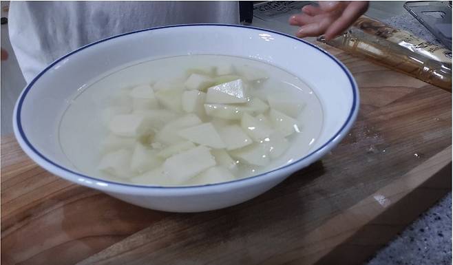 먹기 좋은 크기로 썰어 찬물에 10분 정도 담가 전분기를 빼줍니다.