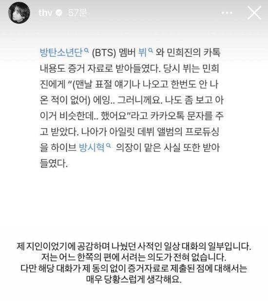 뷔는 20일 자신의 SNS를 통해 “지인으로서 공감하며 나눴던 사적인 일상 대화의 일부”라고 설명하며 “어느 한쪽의 편에 서려는 의도는 전혀 없다”고 선을 그었습니다. 이어 “해당 대화가 제 동의 없이 증거 자료로 제출된 점에 대해서는 매우 당황스럽다”고 밝혔습니다.