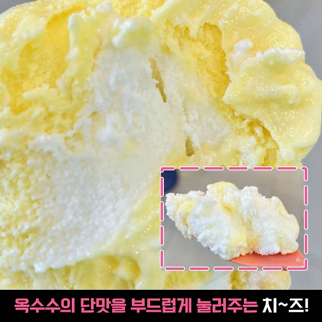 옥수수 러버인 밥심이지만, 구성이 only 옥수수 아이스크림이었다면 별을 한 개 덜 줬을지도 몰라요. 그도 그럴 게 옥수수 맛에 치즈 맛이 살짜쿵 피쳐링된 맛의 조화가 신의 한 수더라고요.