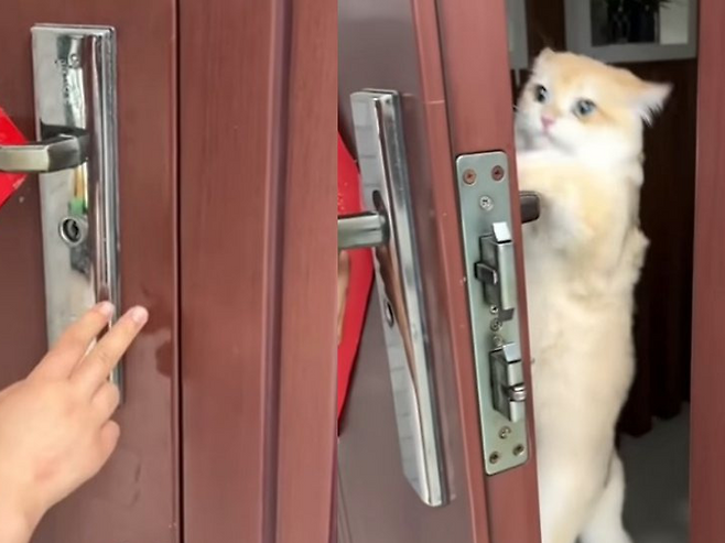 화난 듯 중얼거리며 다가온 고양이는 앞발로 능숙하게 잠금장치를 풀기 시작했다. 문고리에 매달려 돌리더니, 철컥. 문이 열렸다.