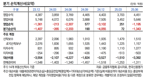 국내 부동산신탁사 14곳의 올해 2분기 순손익을 모두 합산한 결과 1343억원의 순손실이 발생한 것으로 나타났다. 손실의 주된 원인은 책임준공확약형 관리형 개발신탁이다. 사업장 정리 부담이 지속되면서 수익성 회복이 늦어지고 있다.