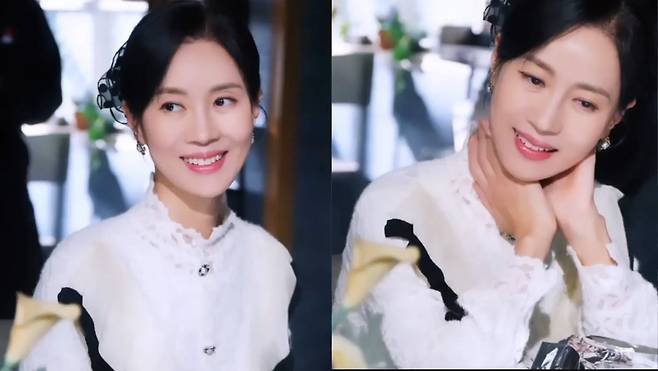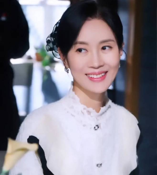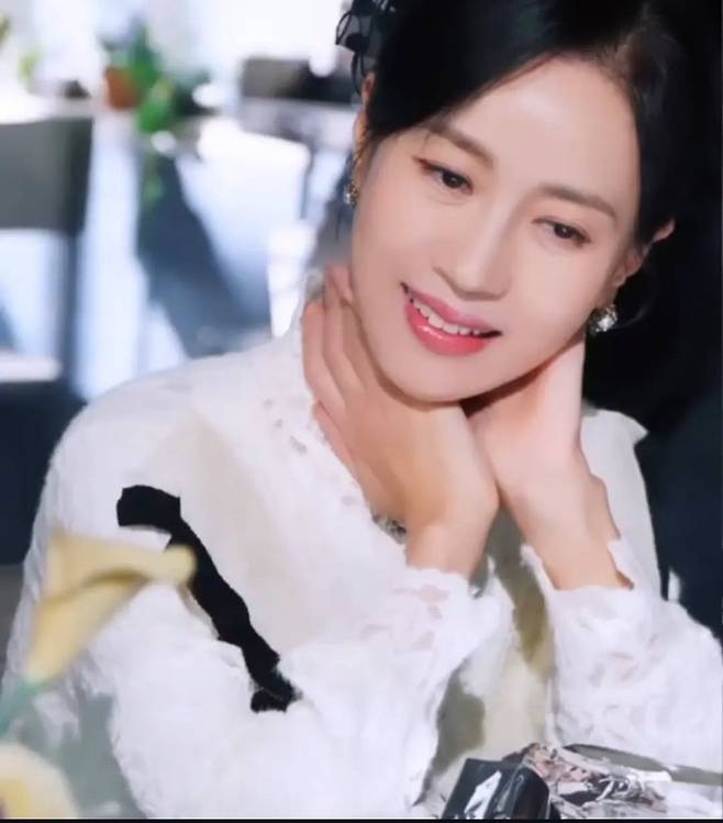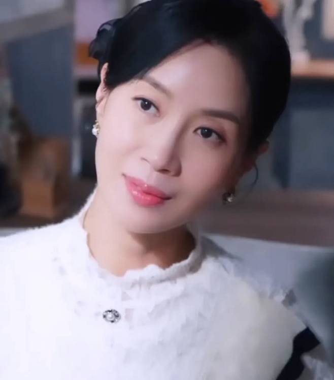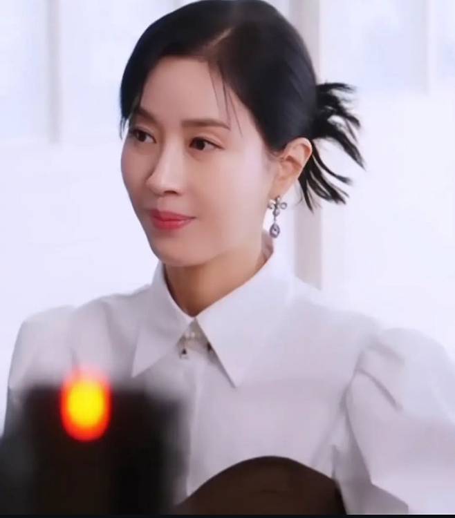 김희정은 고급스러운 레이스와 러플 디테일이 돋보이는 화이트 블라우스를 착용해 우아하면서도 클래식한 무드를 연출했습니다.