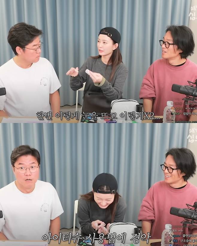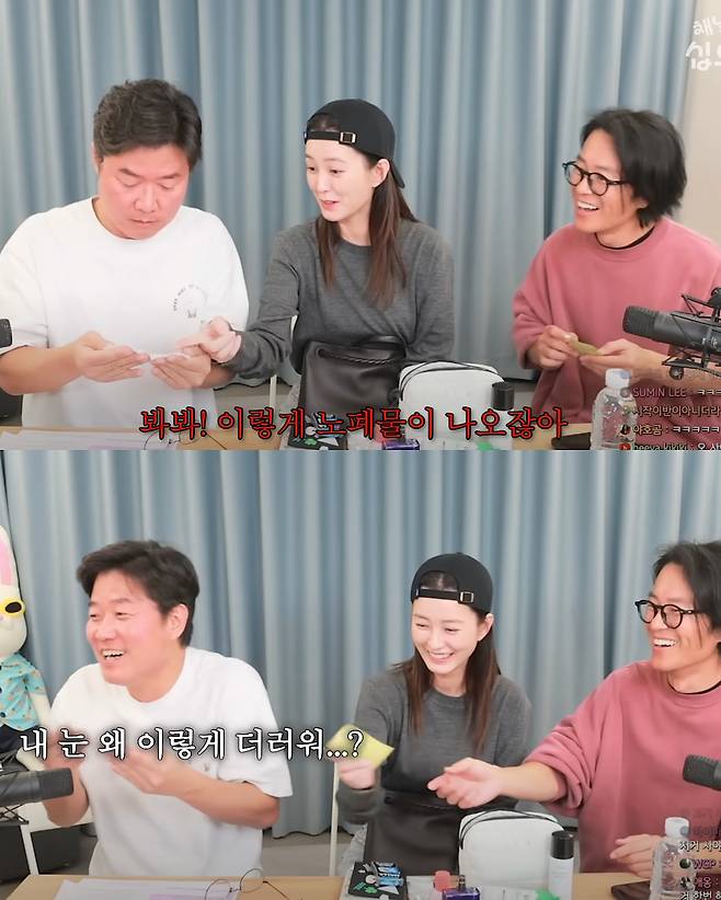 정유미는 "눈을 뜨고 닦아내는 거다"라고 소개해 나영석 PD를 놀라게 했습니다. 실제로는 눈알을 직접 닦는 것이 아니라 눈꺼풀을 부드럽게 닦아내는 방식인데요. 그는 "그냥 눈을 감고 닦아도 시원하다"며 직접 사용을 권유하기도 했습니다. 나영석 PD가 즉석에서 체험해 본 뒤 "내 눈 왜 이렇게 더럽냐"며 감탄해 현장은 웃음바다가 됐습니다.