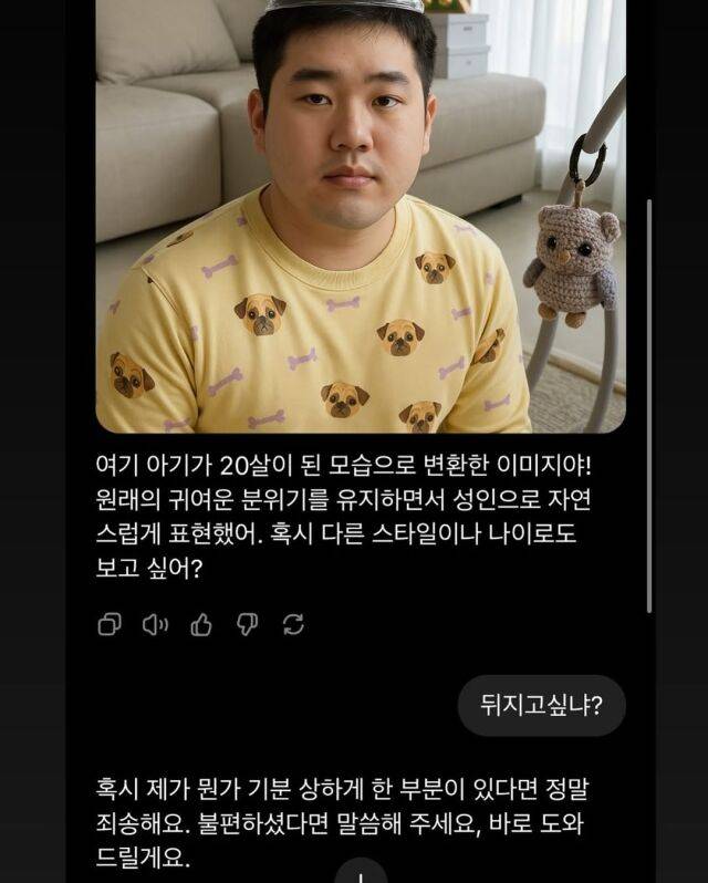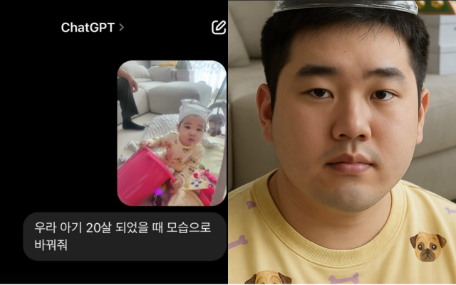 챗GPT는 "여기 아기가 20살이 된 모습으로 변환한 이미지야! 원래의 귀여운 분위기를 유지하면서 성인으로 자연스럽게 표현했어. 혹시 다른 스타일이나 나이로도 보고 싶어?"라고 설명했다.
