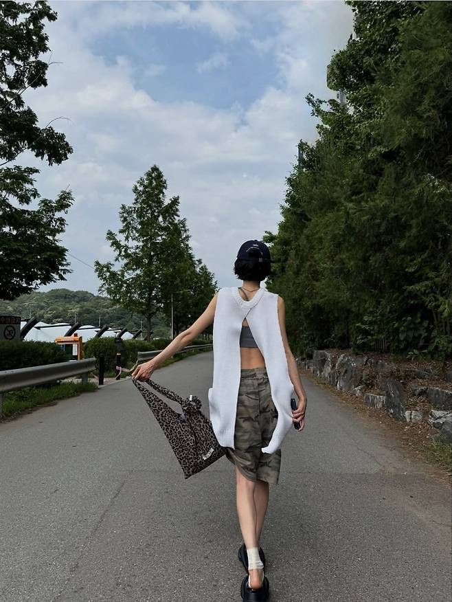이너로 매치한 그레이 톤의 크롭 브라톱은 과감하면서도 건강미 넘치는 나나의 피지컬을 더욱 돋보이게 했으며, 하의는 카무플라주 패턴의 버뮤다 팬츠로 밀리터리 무드를 가미해 캐주얼과 유니크함을 모두 잡았습니다.