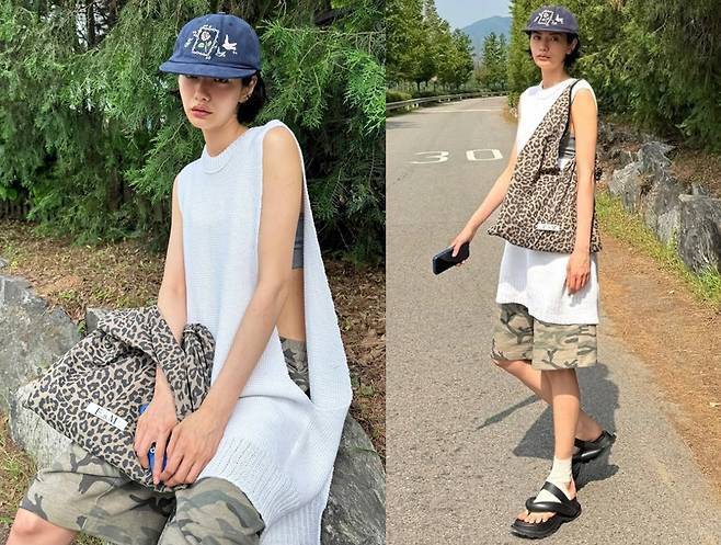 여기에 발목 양말과 스트랩 샌들, 그리고 볼륨감 있는 레오퍼드 프린트 에코백을 더해 트렌디한 믹스매치의 정석을 보여줬습니다.