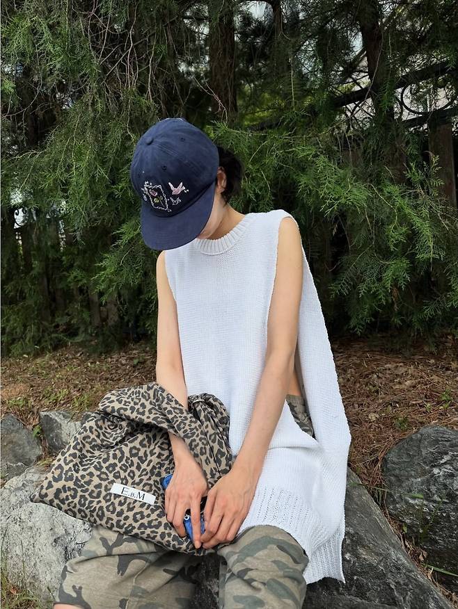 화이트 컬러의 니트 슬리브리스 톱은 루즈한 실루엣과 함께 옆선이 깊게 트여 있어 자유로운 활동성과 스타일리시한 무드를 동시에 자아냈습니다.