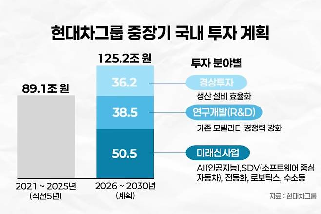 한미 관세 협상 이후 여러 대기업이 국내 투자를 발표했고, 현대차그룹도 2026~2030년까지 5년간 125조 2000억 원을 투자하겠다고 밝혔다. 그룹 역사상 최대 규모다.