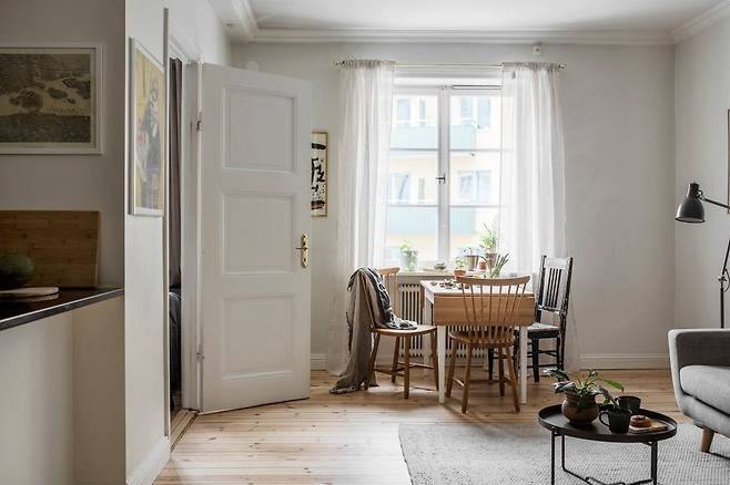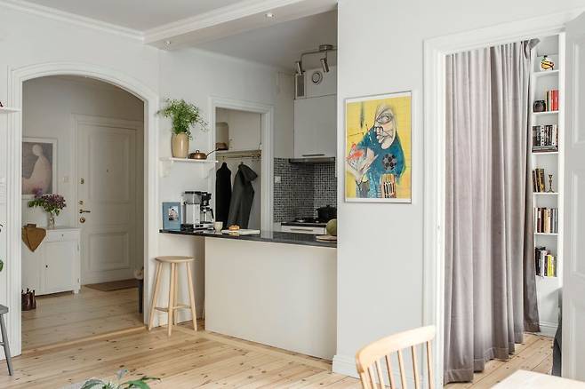 전체적으로 화이트 인테리어지만 상판과 타일에 블랙 포인트를 더해 단조롭지 않은 주방을 연출했다. 길게 뻗은 아일랜드 테이블은 요리할 때도 넉넉한 공간을 제공하며, 주방과 거실의 영역을 부드럽게 구분해주는 기능도 한다.