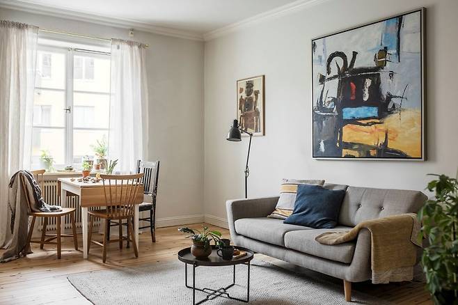 11평의 작은 집이지만 거실 한쪽 벽에 큼직한 컬러 액자를 배치해 강렬한 인상을 남겼다. 2인용 소파와 대형 액자의 균형감 있는 배치는 공간을 더 넓어 보이게 만들고, 벽걸이 TV와 장스탠드 조명으로 감성적인 무드를 더했다.