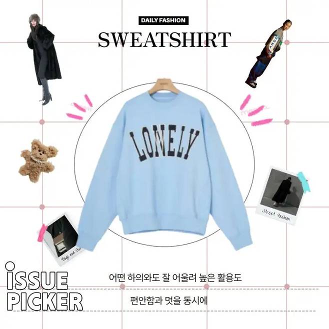 이처럼 맨투맨은 계절과 상관없이 누구나 손쉽게 입을 수 있는 아이템이다. 크롭 디자인을 선택하면 활동적인 느낌이 살아나고 루즈핏으로 입으면 여유로움이 강조된다. 질감이 다른 하의를 매치하면 새로운 스타일로 변한다. 가죽, 데님, 쉬폰 등 어떤 소재를 더하느냐에 따라 매번 다른 인상을 줄 수 있다.