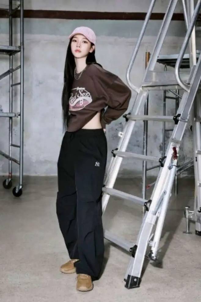 두 번째는 카리나다. 짙은 브라운 크롭 맨투맨을 선택해 스트리트 감성을 드러냈다. 일반적인 길이보다 짧아 허리선이 강조되고 긴 소매 덕분에 여유가 느껴진다.