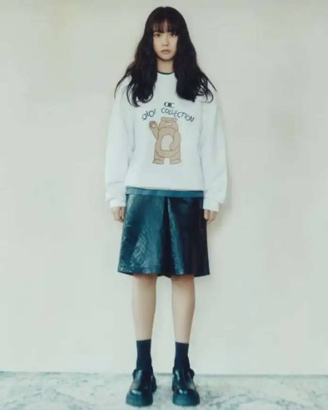마지막은 고민시다. 흰색 맨투맨에 블랙 가죽 스커트를 매치해 질감의 대비를 활용했다. 상의는 귀여운 캐릭터 프린트가 들어가 있어 밝고 가볍다. 스커트는 광택이 있어 묵직한 느낌을 준다.