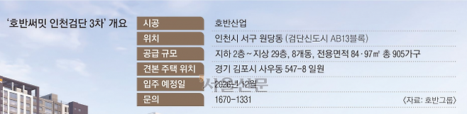 25일 업계에 따르면 호반써밋 인천검단 3차는 인천광역시 서구 원당동(검단신도시 AB13블록)에 지하 2층~지상 29층, 8개 동, 전용면적 84㎡·97㎡의 905가구 규모로 조성된다.