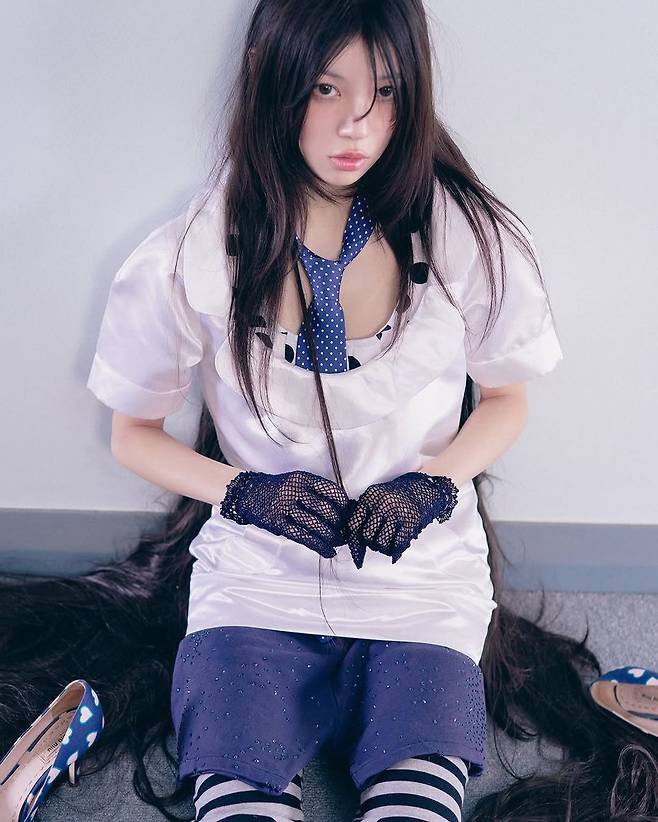 하의는 큐롯 스타일의 네이비 팬츠로, 자잘한 큐빅 디테일이 빛을 받아 은은하게 반짝인다. 여기에 블랙 앤 화이트 스트라이프 타이츠와 블루 하트 패턴 힐을 조합해 Y2K 감성을 완벽히 소환했다. 얼굴을 가릴 듯한 긴 생머리는 스타일링의 극적인 무드를 배가시키며 전체 룩의 무드를 하나로 묶는다.