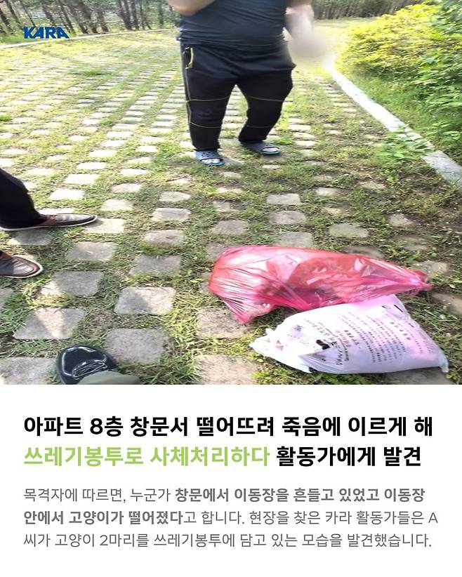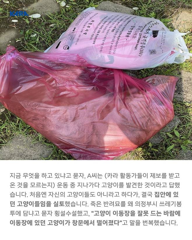 카라(동물권행동카라) 활동가들이 현장에 도착했을 때 목격한 장면은 더욱 충격적이었다. A씨가 두 마리 고양이를 쓰레기봉투에 담고 있는 모습을 발견한 것이다.