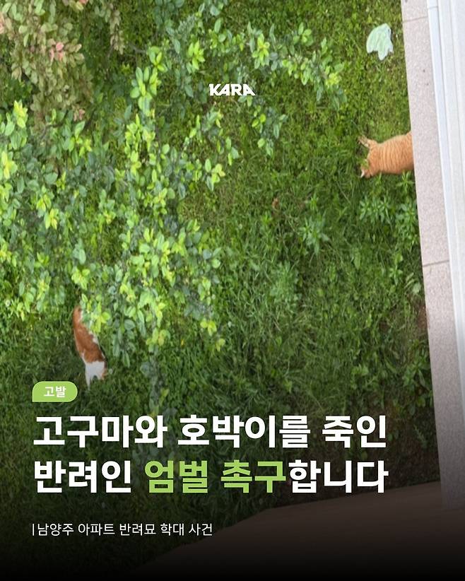 카라는 이 사건을 동물보호법 위반 혐의로 남양주북부경찰서에 고발했다. 고층에서 동물을 떨어뜨려 죽음에 이르게 하는 행위는 명백한 동물학대 범죄다.