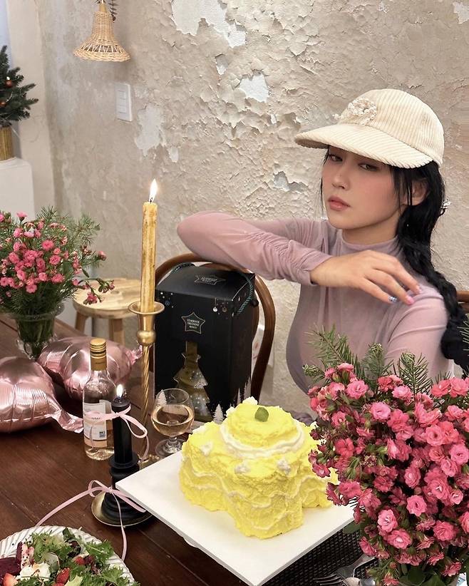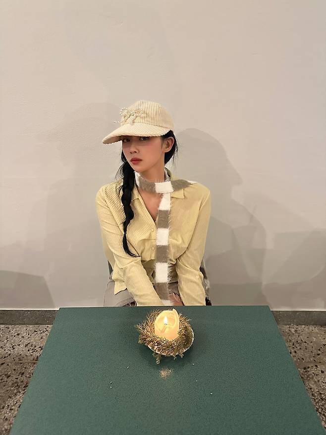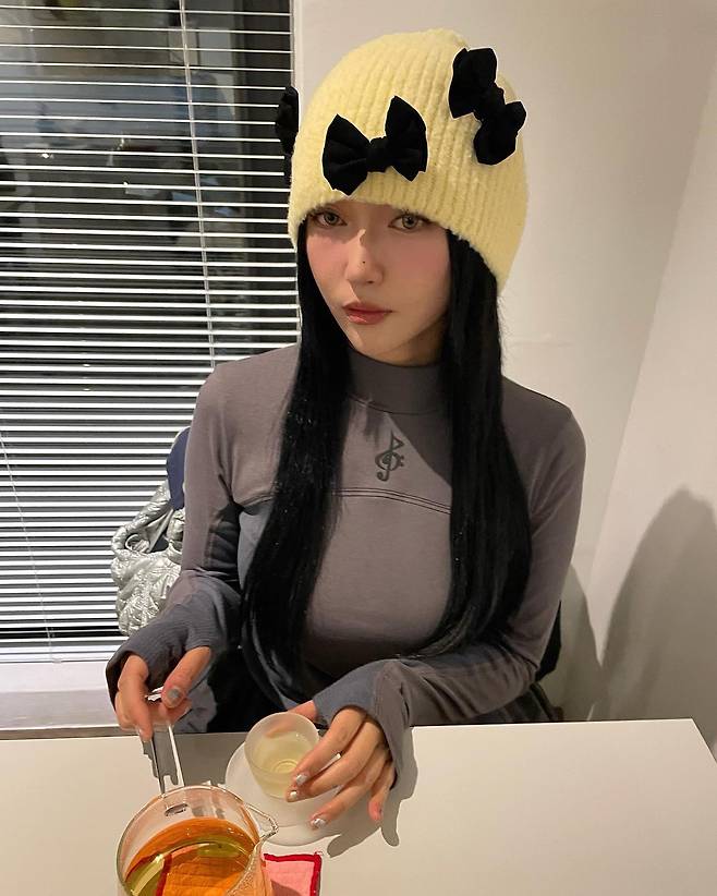머리에는 귀여운 리본이 달린 모자를 매치해 사랑스러운 연말 분위기를 한껏 살렸어요.