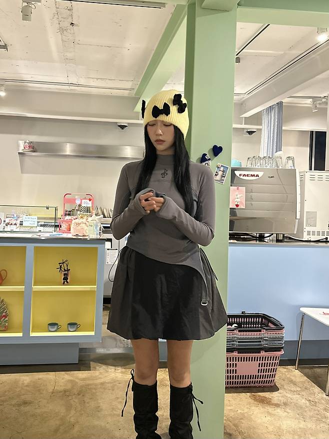 모자와 상의의 색감을 맞추고, 치마의 그레이와 상의의 바닐라 색을