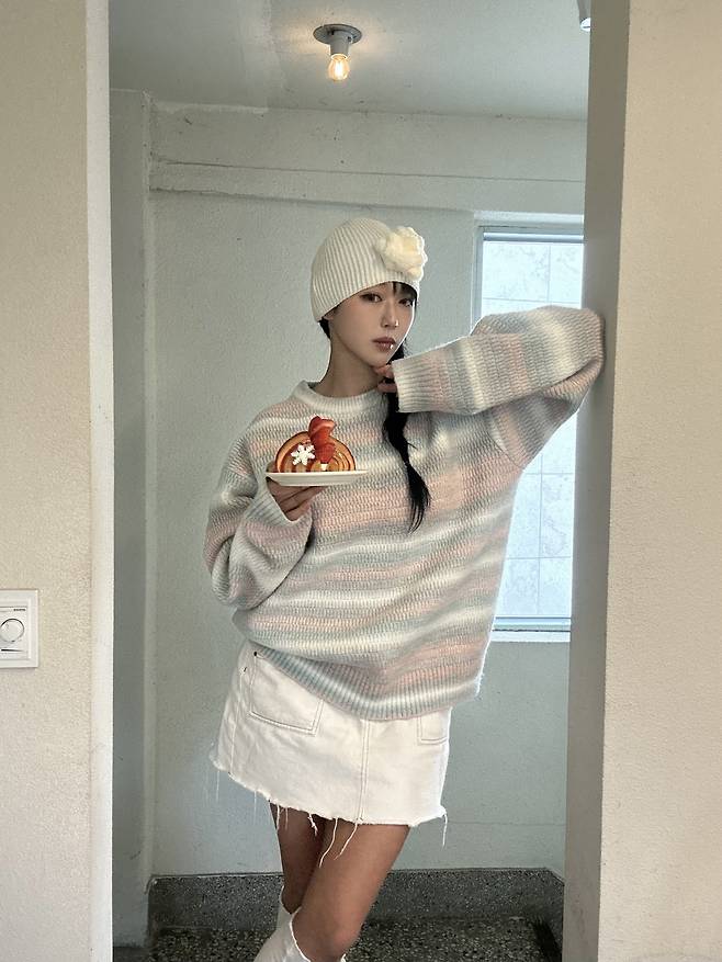 배색이 귀여운 도톰한 오버핏 니트에 플라워 장식 비니,