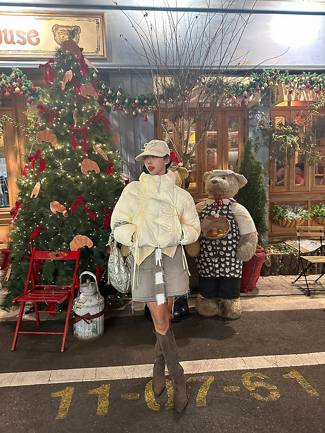 그리고 방방한 부츠를 매치해 보기만 해도 포근해지는 솜사탕 룩을 완성했습니다.