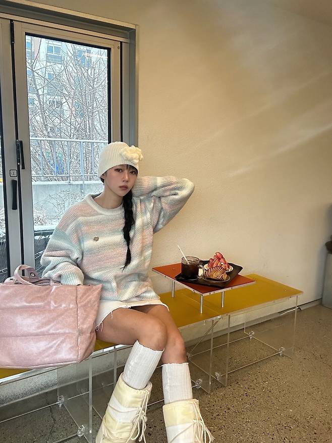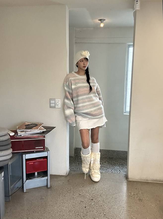 그리고 방방한 부츠를 매치해 보기만 해도 포근해지는 솜사탕 룩을 완성했습니다.