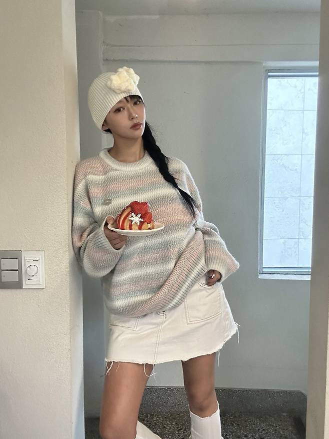 배색이 귀여운 도톰한 오버핏 니트에 플라워 장식 비니,