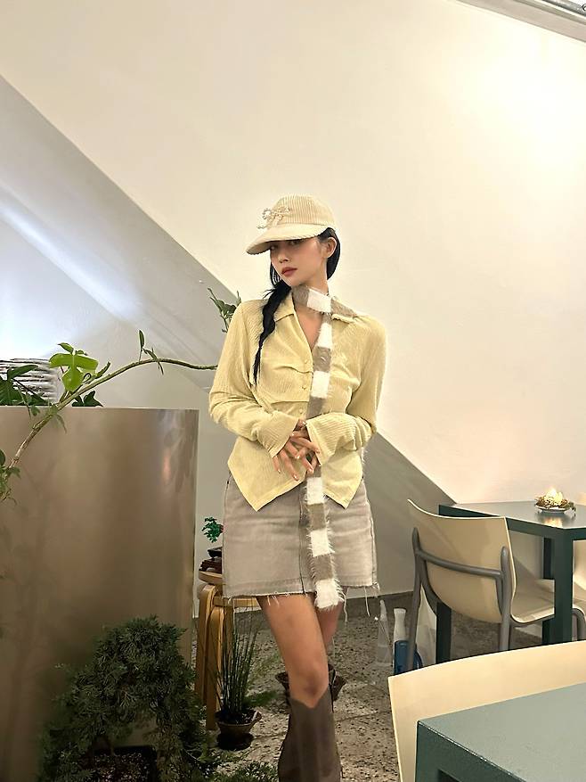 모자와 상의의 색감을 맞추고, 치마의 그레이와 상의의 바닐라 색을