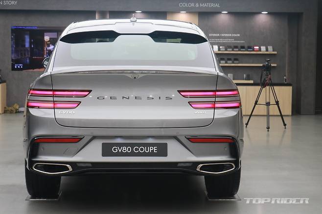 테일게이트 일체형 리어 스포일러에는 보조 제동등이 배치됐다. GV80 쿠페는 트윈 머플러를 기본으로 전용 파워트레인인 가솔린 3.5 터보 48V 일렉트릭 슈퍼차저 선택시 크레스트 그릴 형상의 듀얼 트윈 머플러가 제공된다. 베링 블루는 GV80 쿠페를 위한 전용 외관 컬러다.