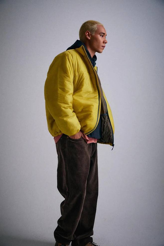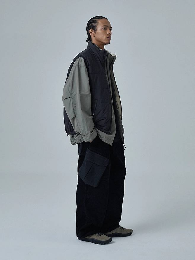 Tip. 모이프는 테크웨어 바이브가 물씬 나는 브랜드인 만큼 경량 패딩과 상성이 좋다. 경량 패딩의 플랫한 디자인이 심심하게 느껴질 때 PCS 컴뱃 코듀로이 팬츠의 입체적인 패턴은 스타일에 재미를 줄 수 있는 위트 있는 선택이다.