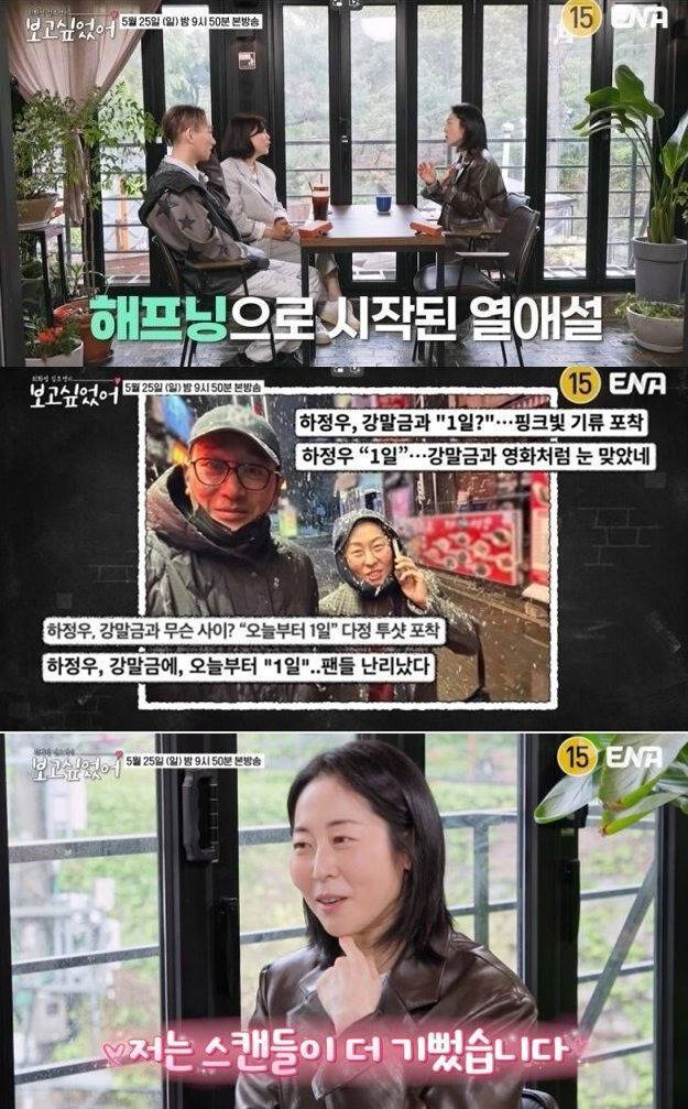 22일 ENA 유튜브 채널엔 ‘최화정 김호영의 보고싶었어’의 선공개 영상이 ‘하정우와 1일?! 강말금이 직접 말해주는 연애설 비하인드’라는 제목으로 업로드됐다.