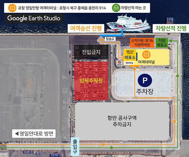 출발 터미널: 울릉크루즈여객터미널 (경상북도 포항시 북구 흥해읍 용한리 914)에서 출발합니다. 터미널 내 주차장은 무료로 이용 가능합니다.